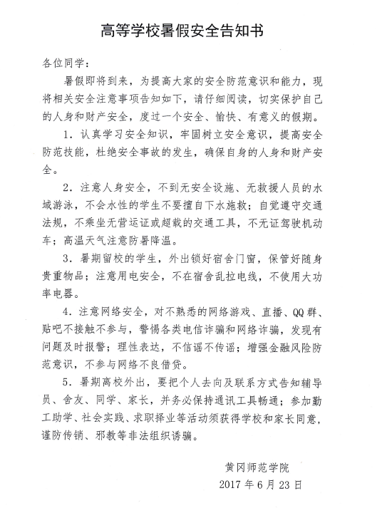 1.放假前,暑假留校的学生须签订《黄冈师范学院学生暑期留校协议书》后方可准许留校。各班制定专人负责,配合学院做好痕迹化管理。
