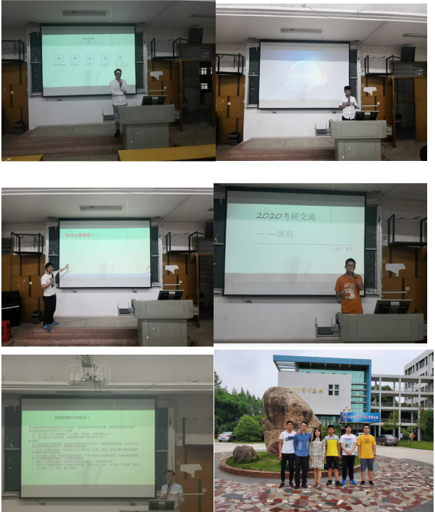会上,由成功考研的学子们依次上台分享考研经验。首先,万洪波围绕基本信息、学习情况、工作实践、获奖情况及浅谈大学五个部分展开,他以自己的亲身经历说明了规划好大学生活的重要性,告诫大家务必有效的去实现大学规划。刘戈分享了考研院校选择的经验,他强调选择院校应从院校类别、专业排名、报比录、专业科目考试和初试复试占比为参考,准确选择院校,谈及自己的考研历程时,他也向大家提出三点个人建议。接着,陈伊铭分享考研复习规划的经验,他提出备考要根据整体时间、各科时间、每天时间和空闲时间合理安排,达到高效复习的目的。紧接着,徐俊杰以考研时间线展开,谈及考研前,考研中,考试前的心态变化。他提出三点建议并要求大家及时调整,时刻对自己充满信心。最后,夏乐以考研调剂为主和大家进行交流,他从四点阐述2019年考研调剂的变化并强调调剂系统开放之前打好信息战的重要性。江俊新对各位分享考研经验的同学表示感谢并进行会议总结。