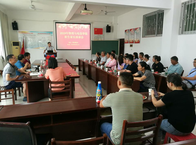 8月31日下午3点,新生入学伊始,物理与电信学院2019级新生家长座谈会在电信楼205举行。学院党总支书记杜杰、院长兰智高、副书记周继国、副院长丁如春、徐火希出席座谈会,就2019级新生的学习、生活以及家长们的疑问做了详细解答。20余名新生家长参加了座谈会,座谈会由副书记周继国主持。
