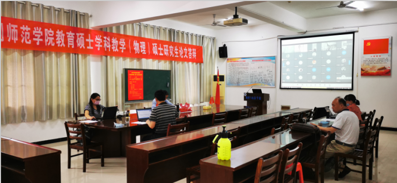 2020年5月28日下午,物理与电信学院采取线上线下相结合的方式,在物电楼205如期举行了2018级硕士研究生学位论文答辩会。我校学科教学(物理)专业首位研究生黄学涛(导师杨昌权教授)同学就课题“‘3+1+2’模式下高中生物理科目选择的影响因素研究——以黄冈市部分高中为例”进行了答辩。