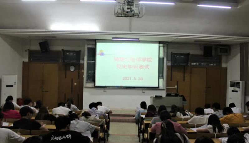 为了检验我院党员、发展对象及入党积极分子们的整体素质,提高思想觉悟,强化他们对党的深刻认识,激发了同学们的爱国情怀。物理与电信学院于5月30日晚在博学楼进行了党史知识测试。