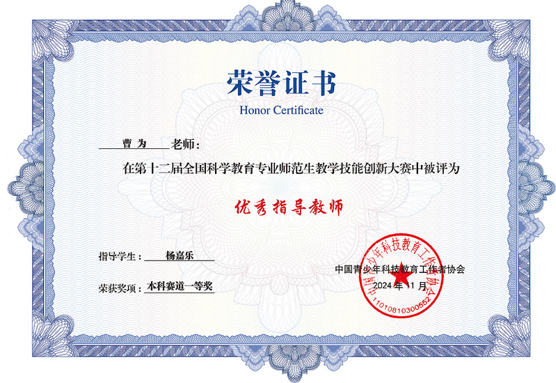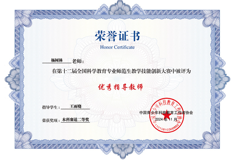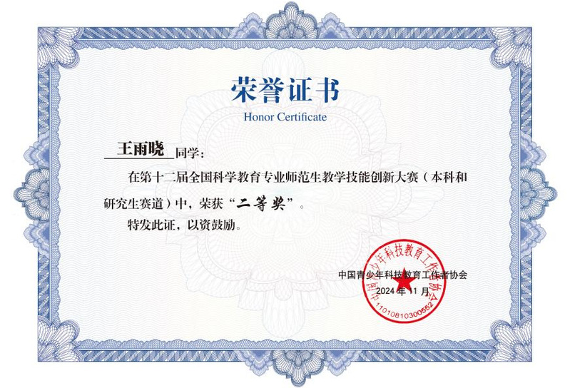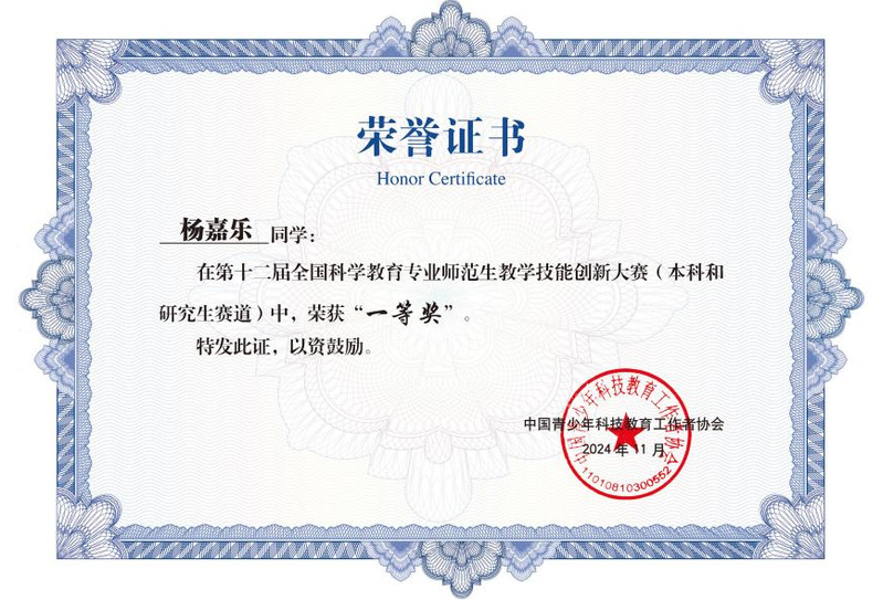 2024年11月2日至3日,由中国青少年科技工作者协会主办,中国青少年科技工作者协会科学教师教育专业委员会和江苏第二师范学院共同承办的“第十二届全国科学教育专业师范生教学技能创新大赛”决赛在南京成功举办。本届大赛共收到北京大学、东南大学、华南师范大学、华中师范大学和南京师范大学等105所大专院校共计1190名选手提交的作品。黄冈师范学院共有5名学生进入决赛,获得一等奖2项、二等奖3项。其中,物理与电信学院光电信息科学与工程专业的杨嘉乐同学和物理学专业的王雨晓同学,经过激烈角逐,分别获得本科赛道一等奖和二等奖,充分展现了我院学生优秀的科学素质和卓越的教学技能。