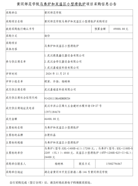 黄冈师范学院马弗炉和双温区小型滑轨炉公开面向社会询价招标,并在物理与电信学院网上公示,共收到有效标书3份,学院组织人员开标,开标结果为:武汉嘉瑞星科技有限公司以人民币46400元的价格中标。