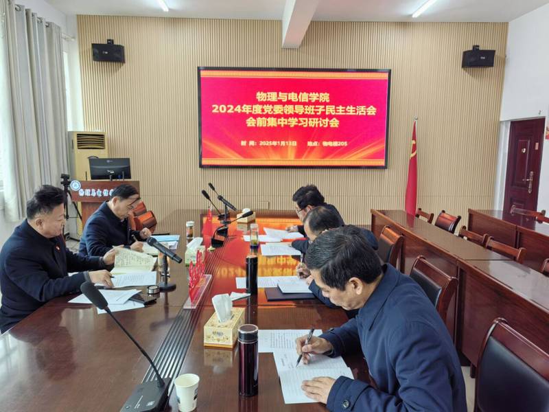 2025年1月13日,物理与电信学院在学院会议室召开了2024年度民主生活会会前学习研讨会。此次会议旨在深入学习党的最新理论成果,贯彻党的教育方针,提升领导班子的政治素养和领导能力,为即将召开的民主生活会做好充分准备。会议由物理与电信学院党委书记卢年桥主持,学院领导班子全体成员出席了会议。