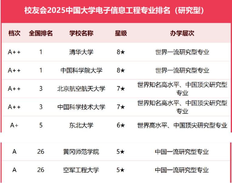 2025年3月,全国第三方大学评价机构艾瑞深校友会网(Cuaa.net)最新发布校友会2025中国大学一流专业排名、2025中国大学电子信息工程专业排名,全国共1308所本科高校的近6万个本科专业上榜。