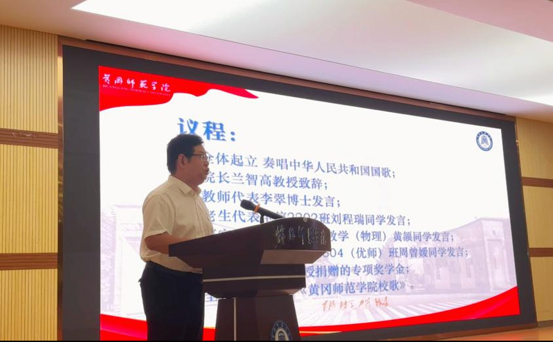 国歌毕,学院院长兰智高教授发表题为《追求卓越,做最好的自己——我的大学我做主》的讲话。兰院长在讲话中,回顾了黄冈师范学院百余年的办学历史与辉煌成就,并向与会人员介绍了学院在物理学、电子信息工程、光电信息科学与工程等专业的建设成果与师资力量,勉励新生深刻理解专业内涵、明确发展方向。兰院长强调大学生自律的重要性,提醒同学们合理安排时间、理性使用手机、树立正确消费观,做有目标、有规划、有担当的新时代大学生。他鼓励大家结合社会需求与个人特长,制定科学的大学四年规划,积极参与学科竞赛、科研创新与社会实践,不断提升专业能力与综合素质,以扎实的专业知识、创新的思维能力,在物电领域探索未知、追逐梦想。