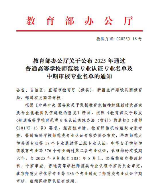 近日,教育部办公厅发布《关于公布2025年通过普通高等学校师范类专业认证专业名单及中期审核专业名单的通知》(教师厅函〔2025〕18 号),我院物理学专业顺利通过了中学教育第二级专业认证,认证有效期六年。
